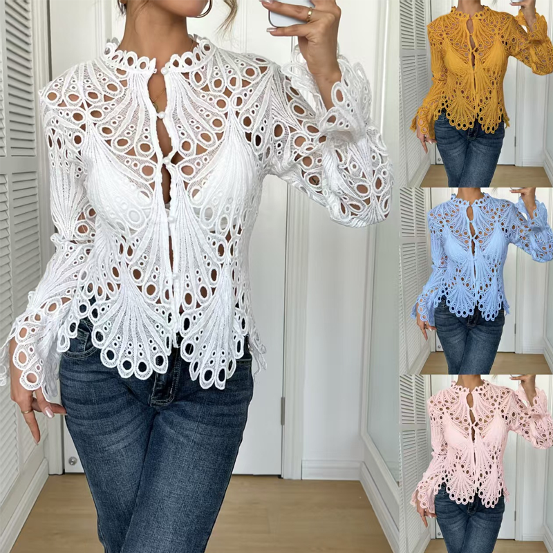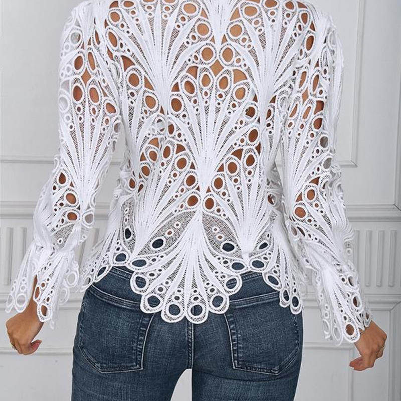 Elegant Hollow-Out Lace Blouse with Bell Sleeves