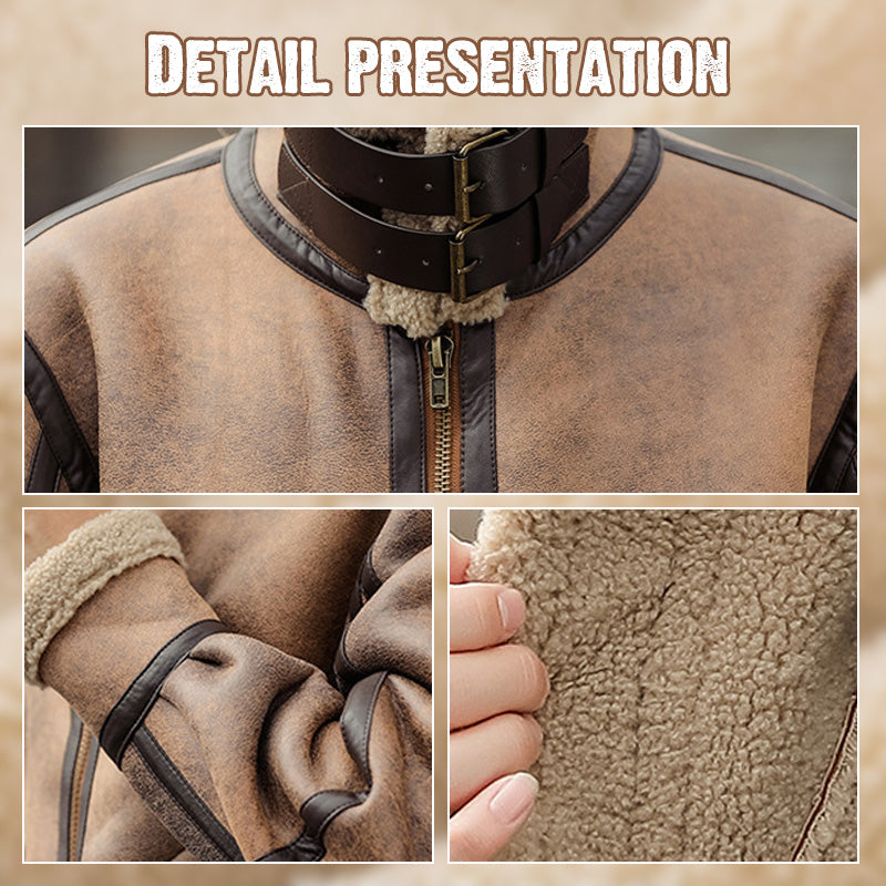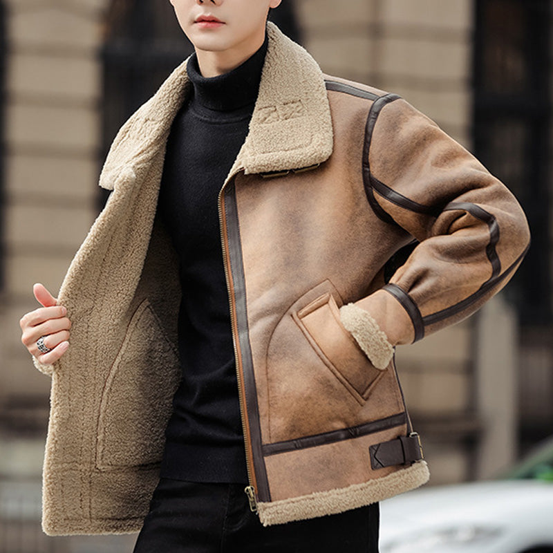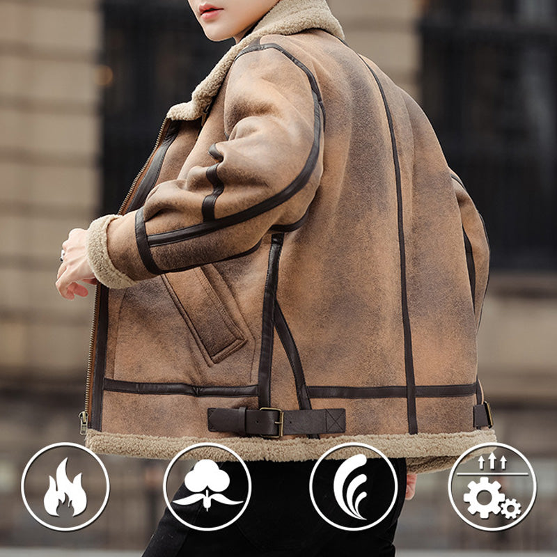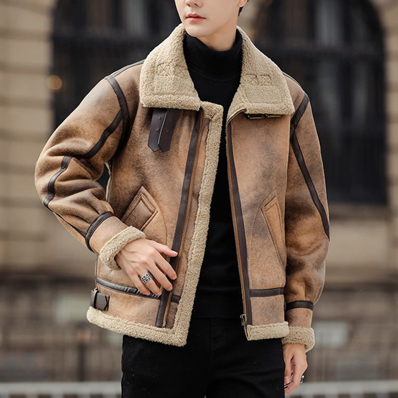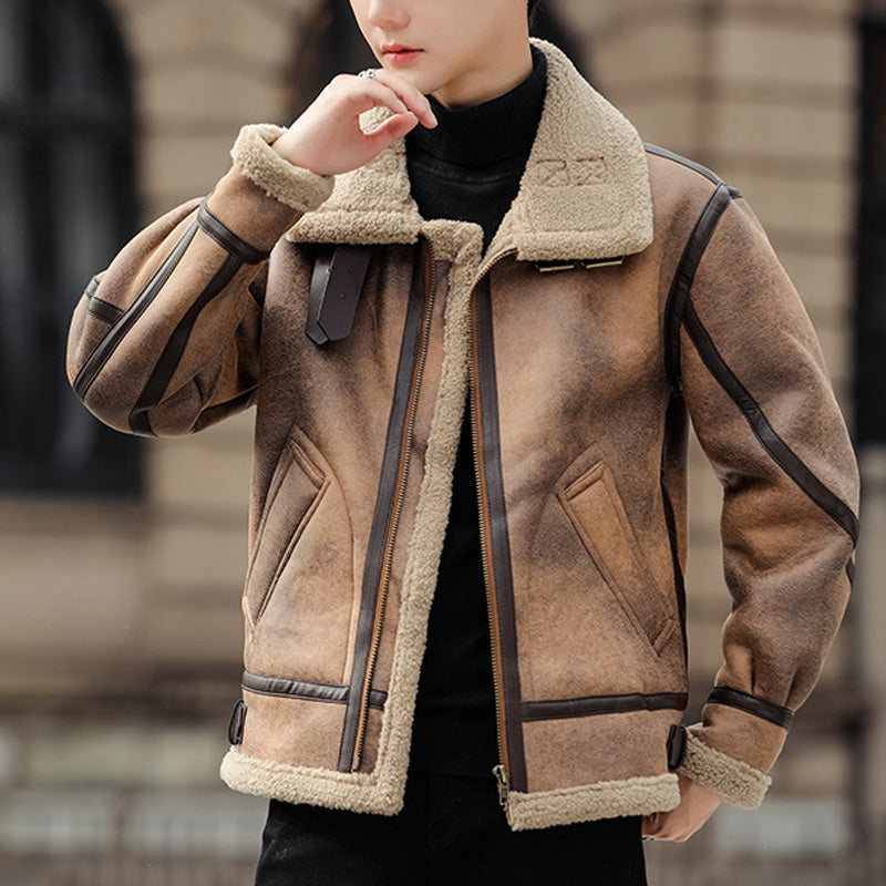 Men's Turn-Down Collar PU Leather Jacket with Plush Interior