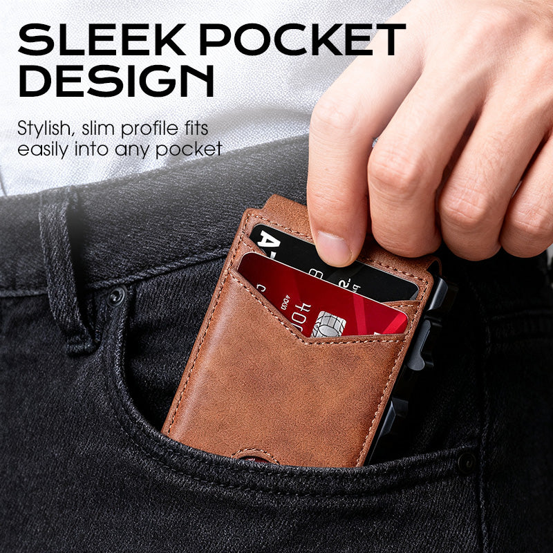 HIGH-SPEED CARD EJECTION: For your main collection of cards, the built-in aluminum card case features an easy-to-access side button for fast, one-handed card retrieval. This push-button mechanism allows for a smooth, fanned ejection, helping you select your card instantly. This system lets you breeze through checkout lines and stay on the move.