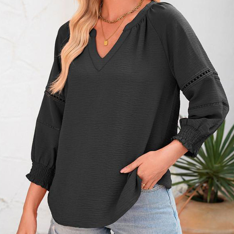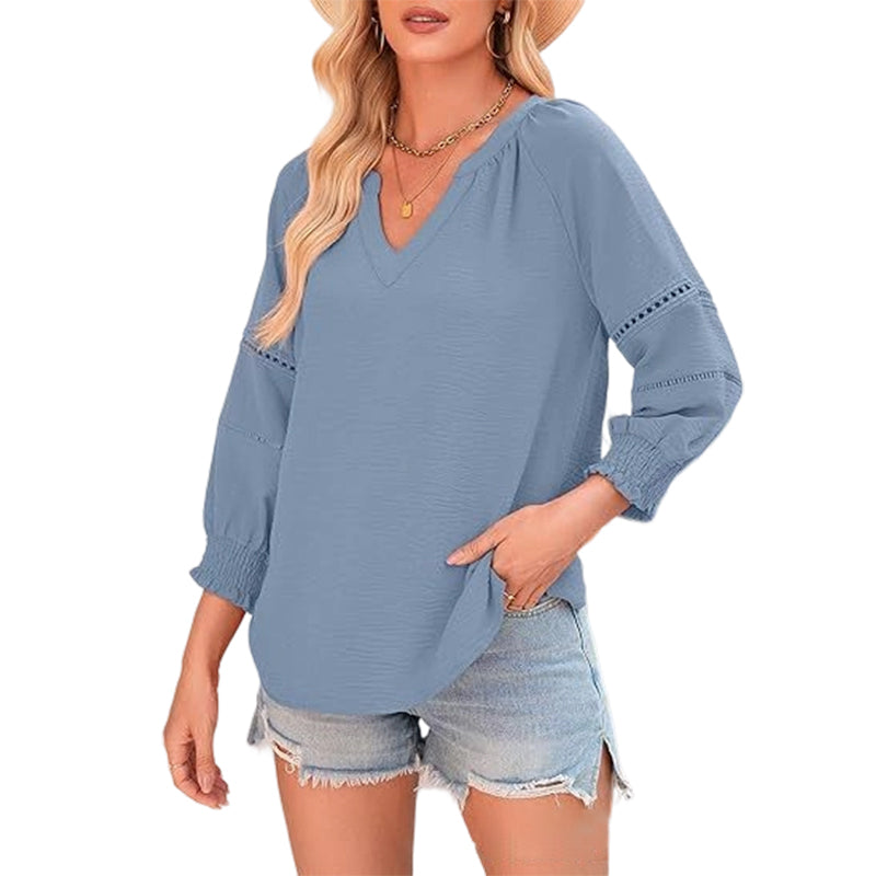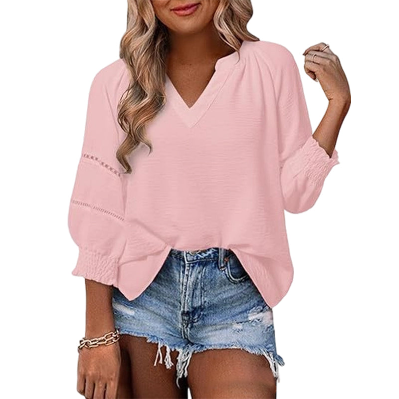 ✨ 50% OFF NOW! 🌸 Women's Casual V-Neck Lantern Sleeve Top – Hollow-Out Detail, Smocked Cuffs & Breathable Texture