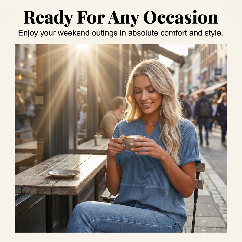 SPLIT V-NECK DESIGN - The unique split V-neckline adds a touch of modern sophistication, elegantly framing your collarbone and allowing you to showcase your favorite necklaces for a chic, elevated look.