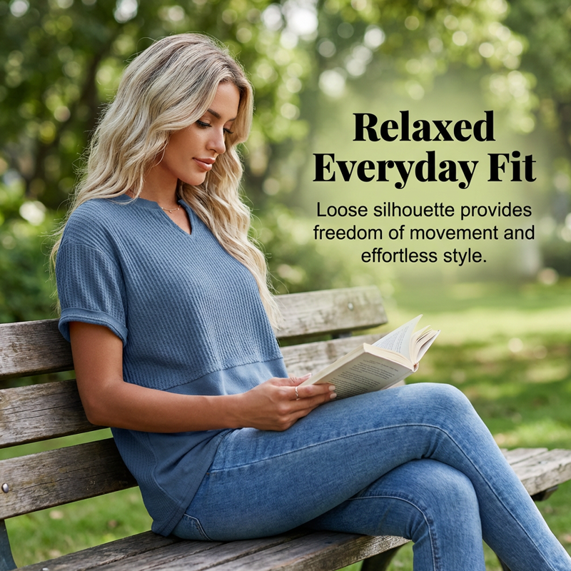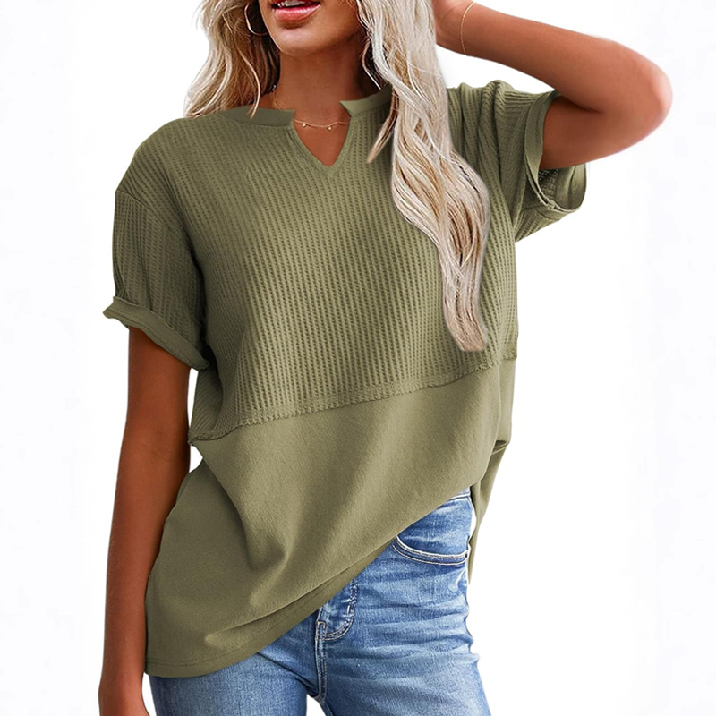Women's Casual V-Neck Waffle Knit Patchwork T-Shirt