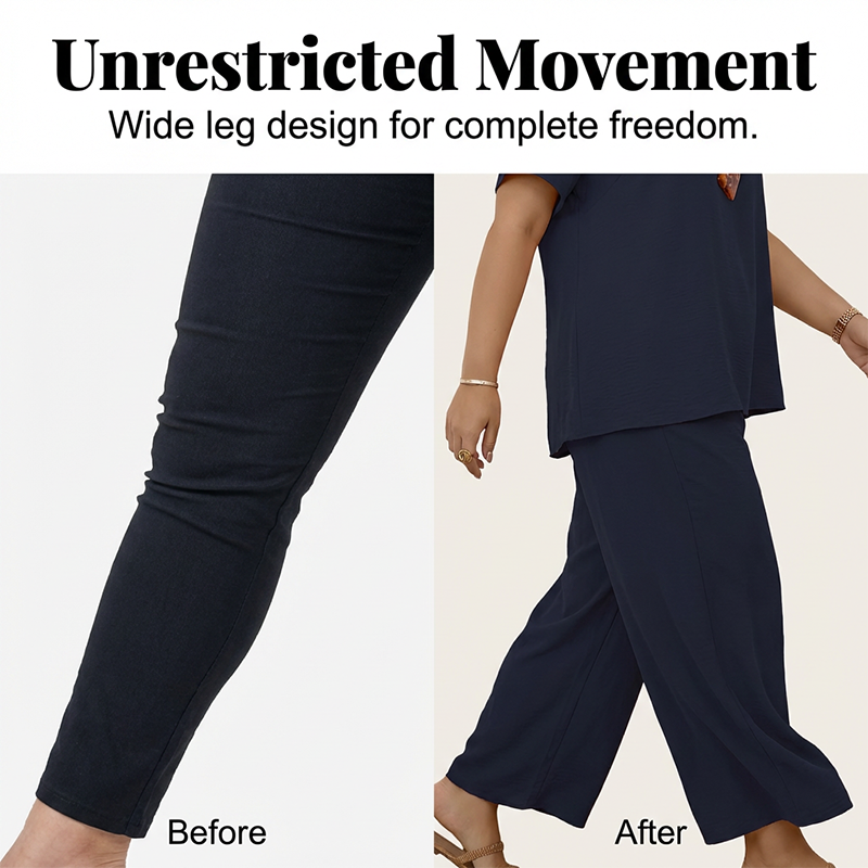 RELAXED FIT - Ensures all-day comfort and unrestricted movement. The loose-fitting top and wide-leg pants drape gracefully over the body, providing a flattering silhouette that doesn't cling, perfect for various body types.