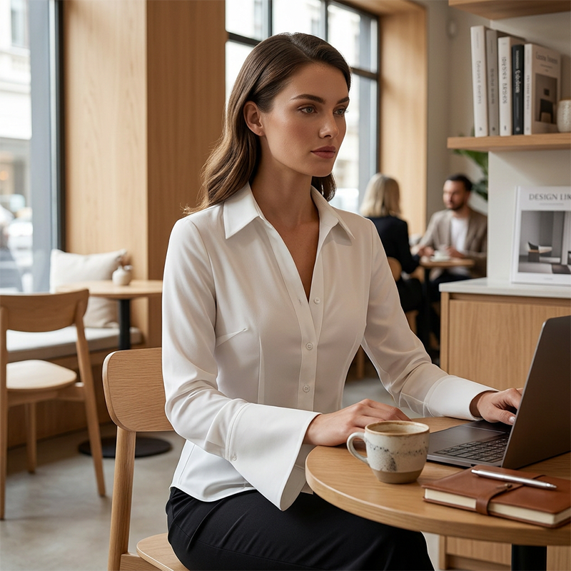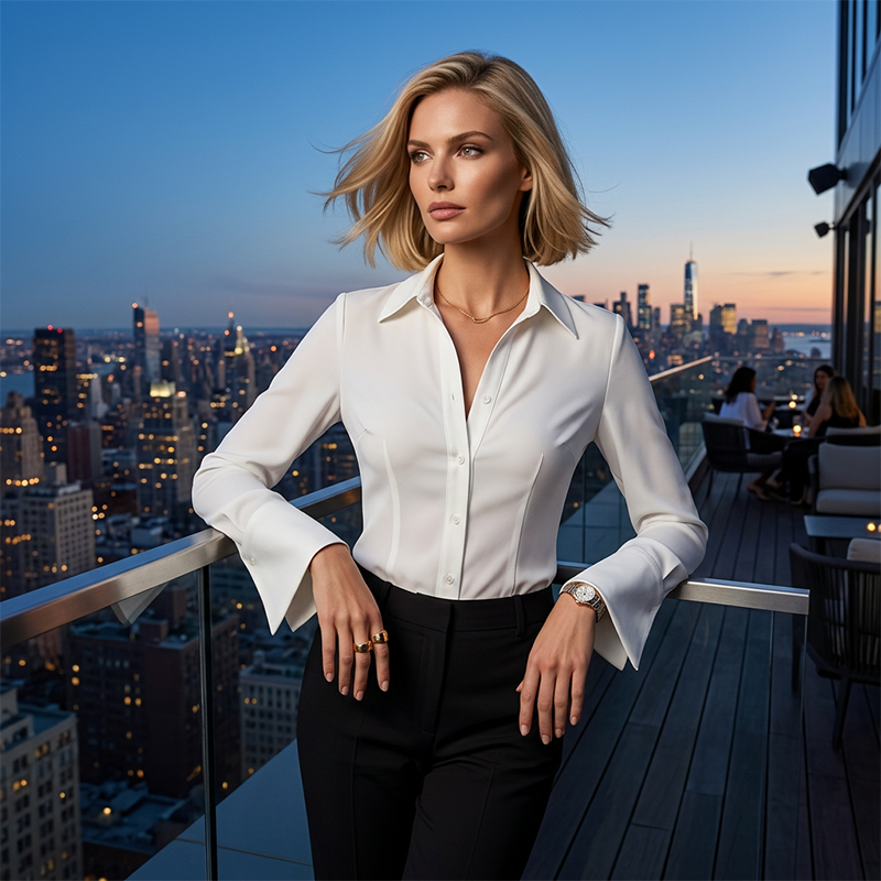 CRISP TURN-DOWN COLLAR - The sharp, structured collar frames the neck beautifully and maintains its shape throughout the day. It provides a clean, professional foundation, perfect for layering or wearing on its own.